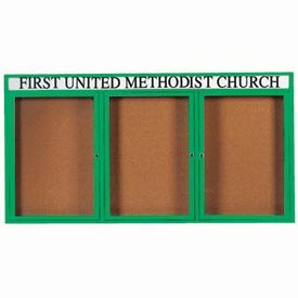 Enclosed Aluminum Frame Bulletin Boards with a Green Powder Coated Finish are made of custom extruded parts engineered to provide accurate, durable and handsome cabinets. All corners are neatly mitered and assembled with heavy duty reinforcements and fasteners. Lockable doors are mounted with a full length piano hinge and feature acrylic safety glass windows. The background is an attractive Natural Pebble Grain Cork tackable panel. Concealed mounting brackets are provided. Headers are standard white opaque acrylic lettered with durable optional black cut vinyl letters. For custom message, please call to specify order at no extra charge. Standard Type face is Clear Gothic. Unit is Illuminated with UL listed fluorescent fixtures feature a light diffuser. A 3 wire electrical lead is provided 72"W x 36"H. This is a 3 Door unit. 74.00 L. 38.00 W. 4.00 H.