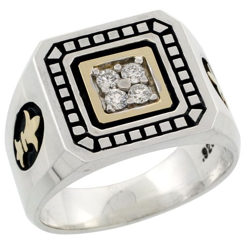 | Post Date : Apr 19, 2012 16:00:19 | Usually ships in 4-5 business daysThis Masculine Ring is crafted from Solid Sterling Silver and accented with Real 10 Karat Gold. This high quality piece of jewelry has Unbelievably Great Weight and has Outstanding Finish. It's set with Round Brilliant Cut (Clean & White) H Color & VS Clarity Diamonds. Sizes are available from 10 to 12 (Including Half Sizes), and they're readily selectable from the drop-down menu. Smaller or Larger Sizes may also be available for a nominal fee. Please feel free to contact us for any inquiries.